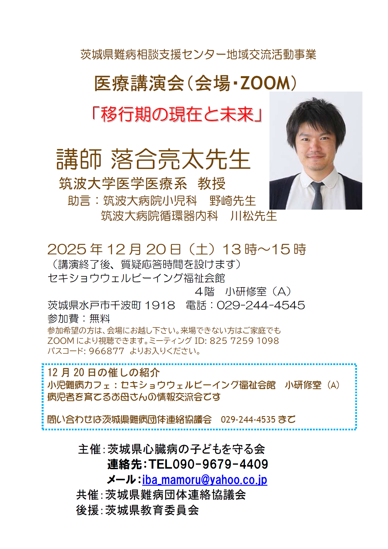 移行期の現在と未来と題した医療講演会を開催します。講師は筑波大の落合教授です。他に小児科の野崎先生、循環器内科の川松先生が助言に加わって下さいます。近隣の方は会場へ。遠方の方はZoomでご参加下さい。